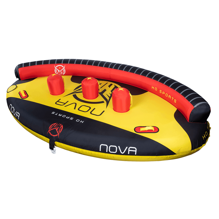 Introducing the Nova Tube series from HO Sports, featuring the Nova 3 and Nova 4 rider tubes. These innovative towables offer strategically angled seats for optimal comfort and stability. Padded seats, air-filled rider dividers, and soft foam handles with knuckle guards ensure safety and enjoyment. With the HO Quick Connect tow attachment system and 2-way Boston valves, setup and deflation are hassle-free. Backed by a 1-year limited warranty, the Nova tubes are perfect for thrilling adventures with friends and family.